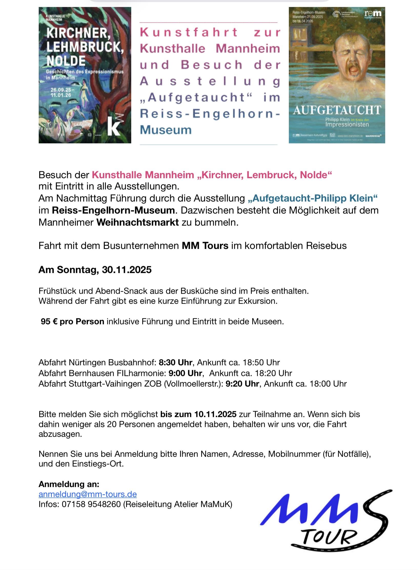 Kunsthalle MannheimKunstfahrt zur Kunsthalle Mannheim und Besuch der Ausstellung „Aufgetaucht“ im Reiss-Engelhorn- Museum Besuch der Kunsthalle Mannheim „Kirchner, Lembruck, Nolde“ mit Eintritt in alle Ausstellungen. Am Nachmittag Führung durch die Ausstellung „Aufgetaucht-Philipp Klein“ im Reiss-Engelhorn-Museum. Dazwischen besteht die Möglichkeit auf dem Mannheimer Weihnachtsmarkt zu bummeln. Fahrt mit dem Busunternehmen MM Tours im komfortablen Reisebus Am … Kunstfahrt nach Mannheim weiterlesen